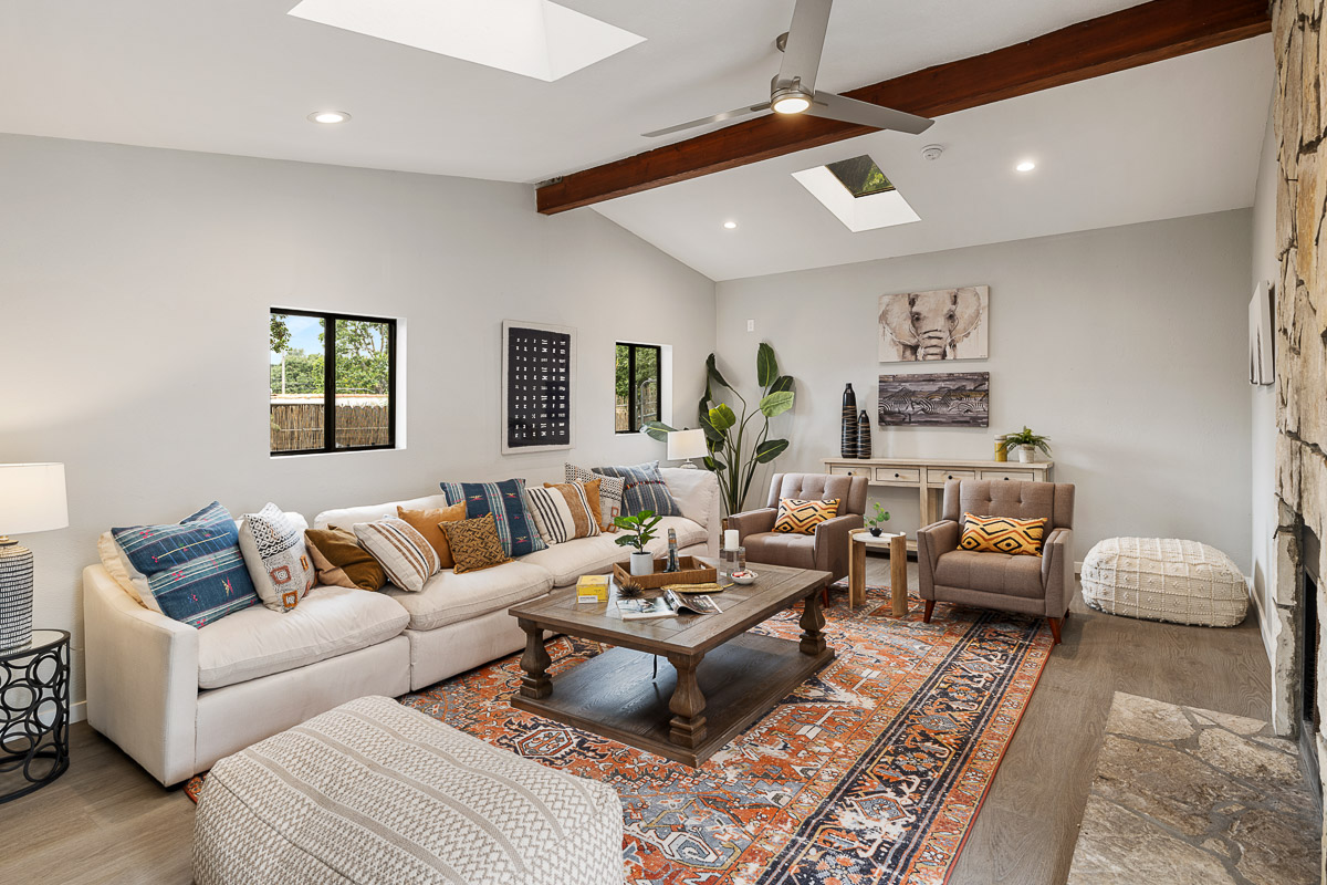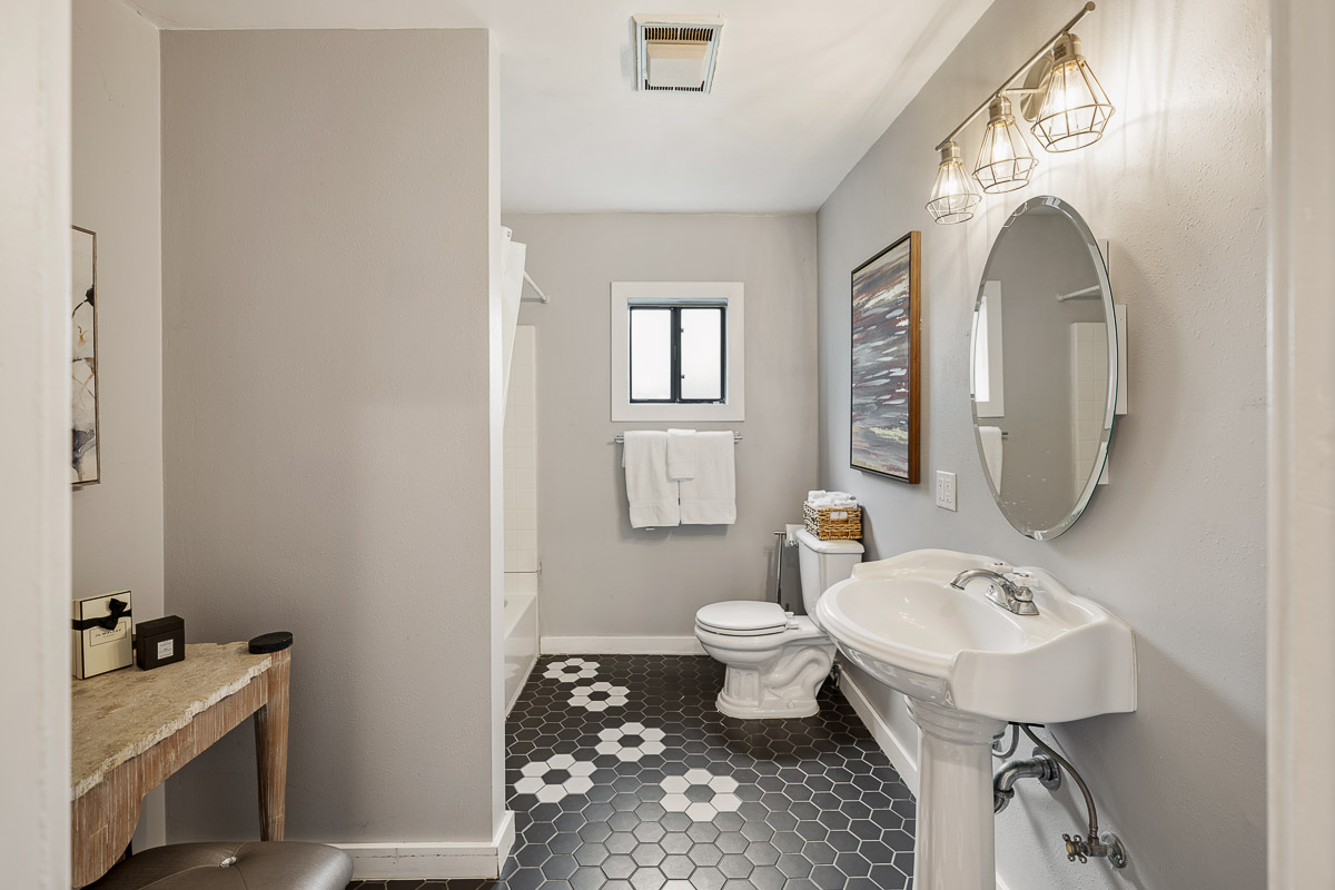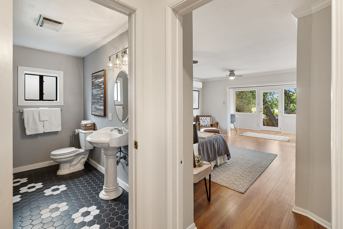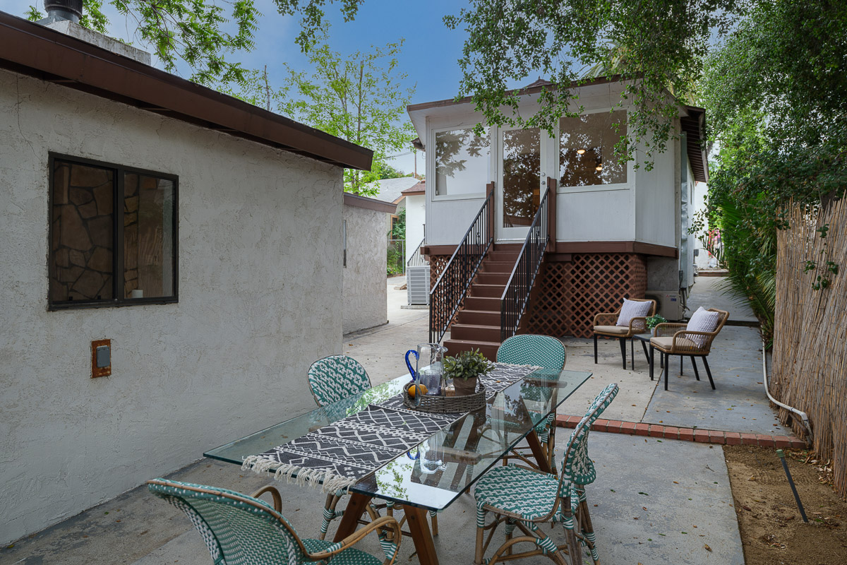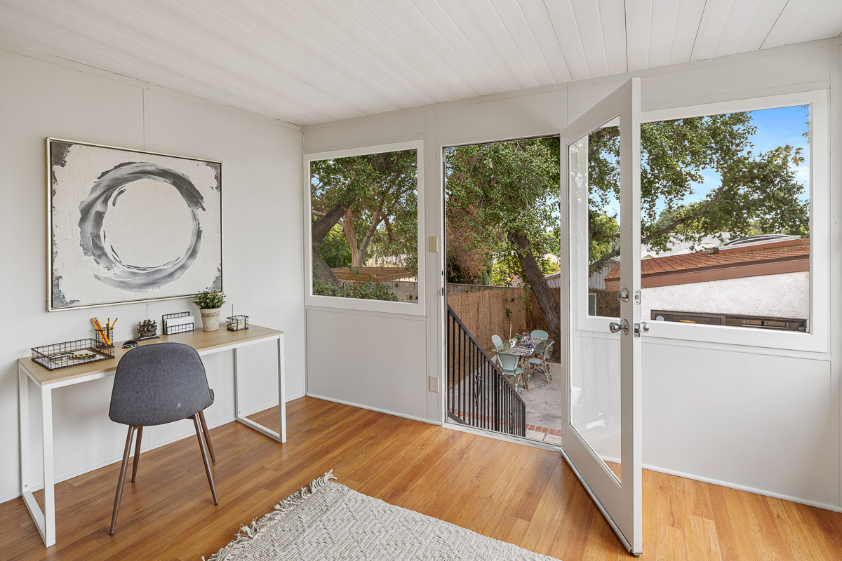 This gracious three bedroom, two bath 1,688 square foot (measured) Spanish, with an expansive 402 square foot (measured) detached bonus office or family room, sits on a quiet cul-de-sac in the beautiful Altadena foothills. The gated property invites you in with a romantic, walled courtyard that is framed by blooming bougainvillea. The Saltillo covered patio steps up to the front door that opens into the elegant interior that has been painstakingly remodeled. The gorgeous living room features gleaming hardwood floors, a central decorative fireplace with artisan tile, an enchanting rich wood mantle, a tray ceiling, recessed lighting and a large front window that frames views of our majestic San Gabriel Mountains rising in the distance. In addition, there is an inviting formal dining room, as well as a picture-perfect, renovated kitchen with butcher block counters, floating stainless steel shelving, an oversized farmhouse sink, a coffee station or wet bar, custom white cabinetry, as well as a quaint breakfast nook. Not to be missed are the three bedrooms, with two spa-like baths, including a spacious primary suite that has a bonus bump-out, as well as an attached, elegantly updated bath. This space, all in the back of the home, has an area that would work equally well as a second closet or a kitchenette so that this wing of the house could be used as a separate living space. It is easily accessed via its own private entrance off the rear of the home. Finally, there is a fantastic bonus room off the garage that has tall glass doors, an ornamental stone fireplace, skylights and a soaring vaulted ceiling. It is stunning and offers limitless possibilities.